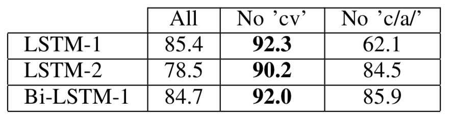 We first wanted to compare the LSTM against a baseline on a relatively easy task, which we call “Known Speakers.” We shuffle up the syllables from all speakers and partition them into a training, validation, and testing set with a 2:1:1 ratio. Some syllables from the same speaker can easily end up in more than one partition. We then evaluated the accuracy at a syllable level for a baseline, 1-layer fully connected neural network, and our three LSTM models.