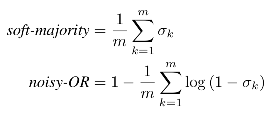 The first experiment was fun, but int he real world, we don’t care much about classifying each syllable as either “healthy” or “unhealthy.” We want to diagnose patients by taking into account any relevant information. Meaning, we need to somehow transform a set of syllable predictions, and aggregate them into one prediction for the patient. We employed two different methods: soft-majority, and a normalized nosiy-OR. They ended up producing absolutely identical results. The equations are below. We calculated the nosiy-OR in log-space and normalized by the number of syllables because each speaker can have a varying number of syllables. This allowed us to directly compare the scores across speakers with such a variance in the number of training examples they provided.