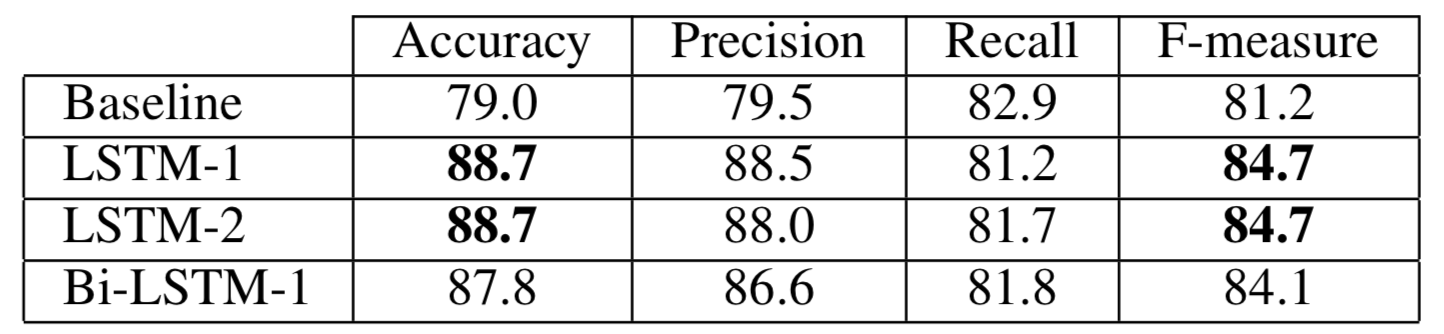A majority classifier would achieve 53% accuracy on this dataset. The baseline is a large improvement, but the LSTM networks come out on top.